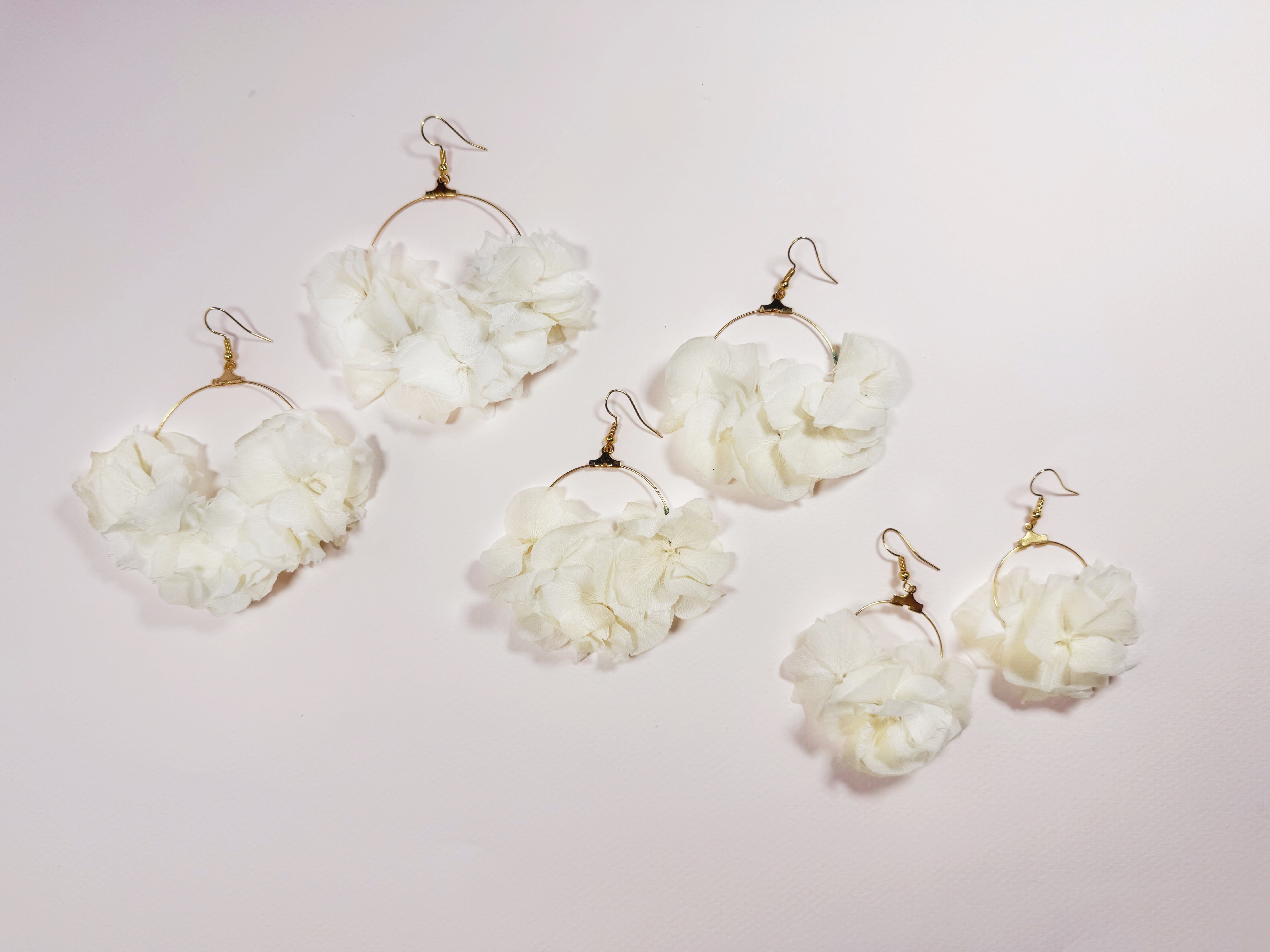 Vous recherchez l’accessoire de mariage qui donnera la note finale à votre tenue de mariée ? Aériennes et délicates, nos boucles d’oreilles Maria seront l’accessoire de mariage idéal pour sublimer votre robe de mariée. Les boucles d’oreille fleuries Maria sont composés de pétales d’hortensia blanc crème stabilisées.